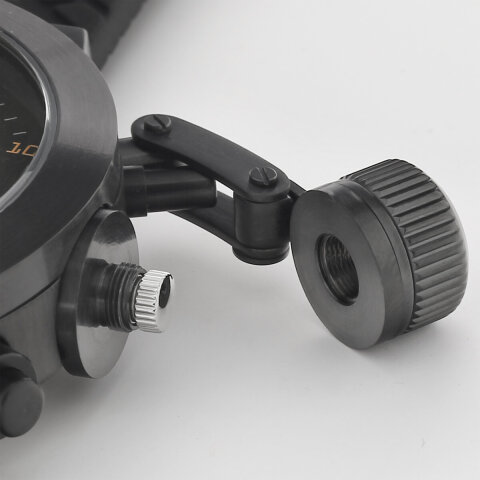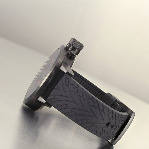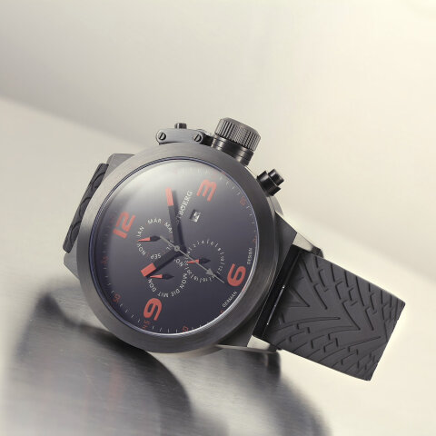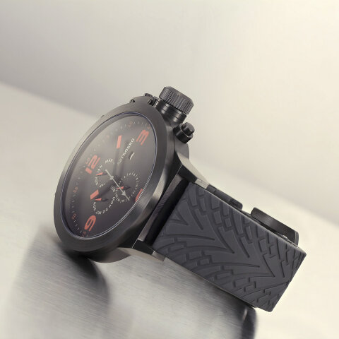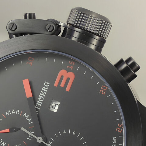Die Astboerg Kingsize zeigt sich hier mit einem tiefschwarzen Zifferblatt, auf dem die kräftig orangefarbenen Ziffern und Zeiger nahezu glühen und der Uhr eine dynamische, fast sportlich-technische Ausstrahlung verleihen. Das robuste, gebürstete Schwarz des Gehäuses harmoniert mit dem strukturierten Kautschukband und lässt die markante Größe der Uhr ausgewogen wirken, während die integrierte Datums-Lupe und die doppelt gesicherte Krone den funktionalen Charakter subtil betonen und dem Gesamtbild technischen Feinsinn hinzufügen.
