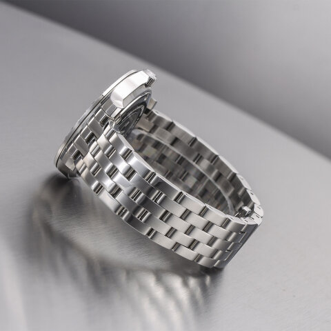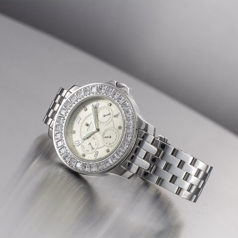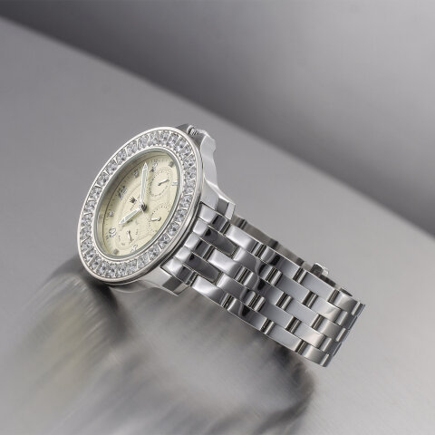 Die Astboerg Royal Diamond beeindruckt durch ihre harmonische Verbindung von Glanz und Struktur. Besonders hervorzuheben ist die Lünette, deren handeingefasste Zirkonen in Pavé-Fassung ein gleichmäßiges, edles Funkeln erzeugen. Das champagnerfarbene, guillochierte Zifferblatt mit erhabenen arabischen Zahlen strahlt eine subtile Wärme aus, während die Diamond-Cut-Zeiger dem Gesamtbild einen modernen, präzisen Akzent verleihen. Das polierte Edelstahlarmband rundet das Erscheinungsbild in ruhiger Eleganz ab und betont die stilvolle Anmut dieser Uhr.