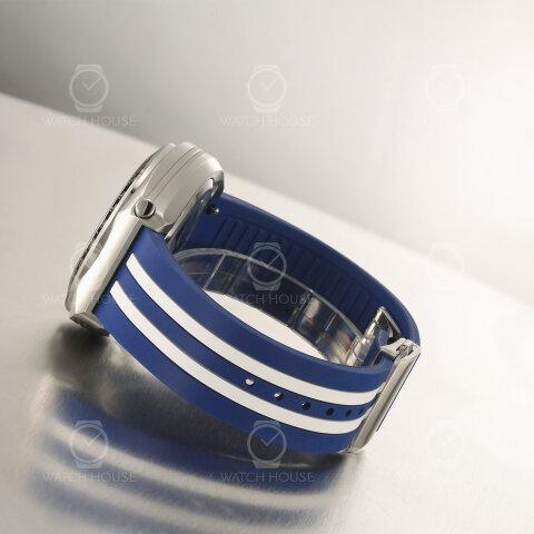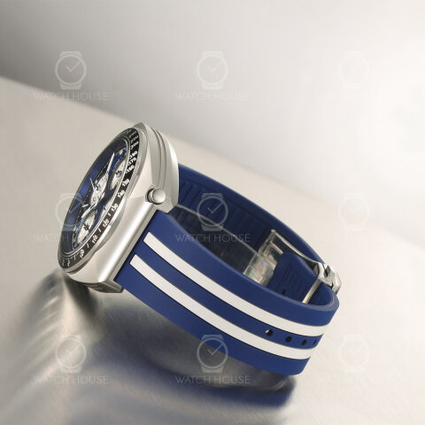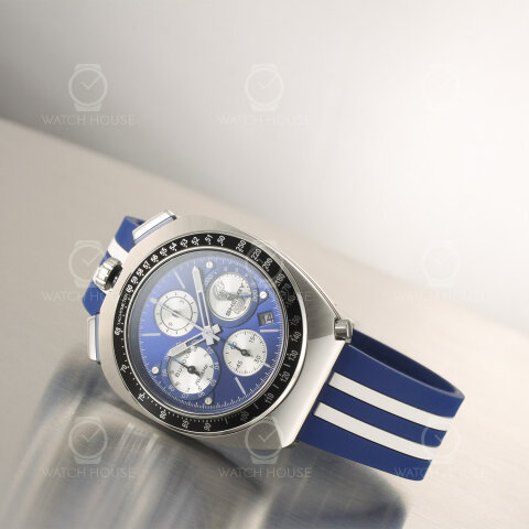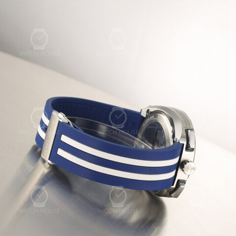 Die Bulova 98B452 wirkt durch ihre markante Farbgebung besonders dynamisch, denn das kräftige Blau des Zifferblatts und des Kautschukarmbands wird von klaren weißen Streifen durchzogen, die einen deutlichen Kontrast setzen und sofort Assoziationen zu Rennwagen hervorrufen. Das Gehäuse in Edelstahl fasst das detailreiche Zifferblatt ein, auf dem silbern schimmernde Totalisatoren für Struktur sorgen und das Shelby-Logo mit der stilisierten Cobra einen Blickfang bildet. Weiße Zeiger und Indizes heben sich klar ab und verleihen der Uhr eine sportlich-technische, zugleich aber auch sehr präzise Anmutung.