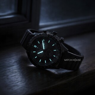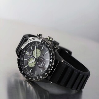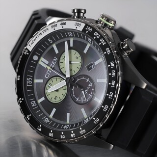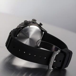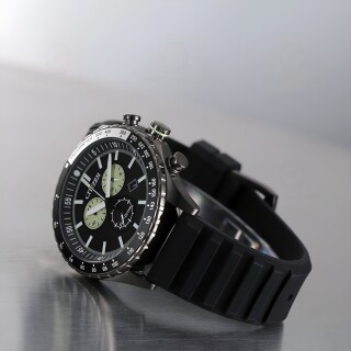Schwarz und Anthrazit bestimmen den ersten Eindruck dieser Citizen, ergänzt durch auffällig hellgrüne Totalisatoren, die dem Zifferblatt eine beinahe instrumentelle Anmutung verleihen. Das dunkle, gebürstete Gehäuse wirkt technisch und reduziert, während das strukturierte Kautschukarmband den sportlichen Charakter betont. Helle Indizes und Zeiger sorgen für visuelle Klarheit und setzen sich präzise vom Hintergrund ab, sodass ein kontrastreicher, funktional geprägter Gesamteindruck entsteht.
