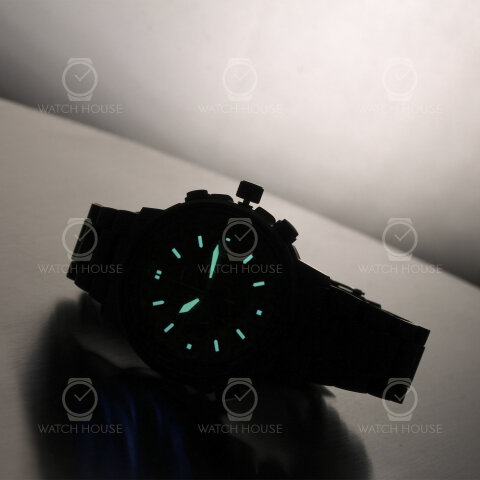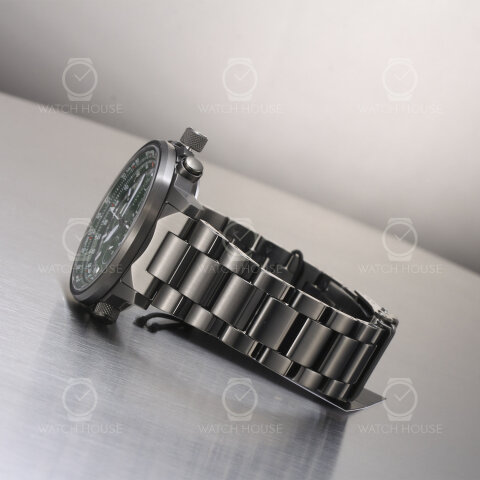 Die Citizen Promaster Sky Funk Chronograph AT8304-57W fällt durch ihr kräftiges anthrazitfarbenes Edelstahlgehäuse und das massive Gliederarmband auf, die der Uhr eine markante Präsenz verleihen. Auf dem tiefgrünen Zifferblatt entfalten sich zahlreiche Anzeigen – vom Chronographen bis zur Weltzeitfunktion – in einer harmonischen, aber komplexen Struktur. Leuchtende Zeiger und Indizes sorgen für gute Ablesbarkeit bei Dunkelheit, während das 43 Millimeter große Gehäuse sportliche Robustheit mit technischer Präzision verbindet.