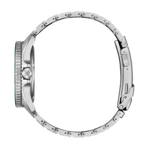 Die grüne Farbgebung sticht bei dieser Variante der Citizen Promaster Eco-Drive Diver sofort ins Auge – das Zifferblatt zeigt einen satten, leicht metallischen Grünton, der zwischen Tiefe und Frische changiert. Passend dazu ist die Taucherlünette in einem abgestimmten Dunkelgrün gehalten, was dem gesamten Erscheinungsbild eine fast naturverbundene, organische Note verleiht. Die weißen Leuchtindizes und die massiven Zeiger sorgen für einen starken Kontrast und lassen das Design trotz der auffälligeren Farbe funktional und strukturiert wirken. Das Gehäuse und Armband aus Edelstahl bleibt bewusst zurückhaltend und verleiht der Uhr Standfestigkeit, ohne ihr die Aufmerksamkeit vom Zifferblatt zu nehmen. Insgesamt wirkt diese Version expressiver als die schwarze, aber weniger kühl als die blaue – eher wie ein sportlicher Begleiter mit einem Hauch Individualität.