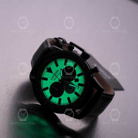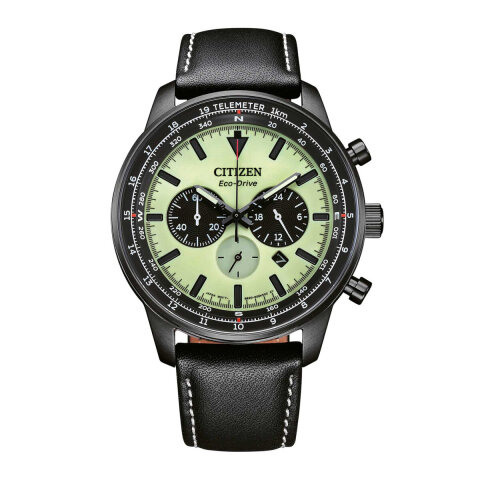 Die Citizen CA4505-21X Eco-Drive Telemeter-Chronograph in Anthrazit-Mint ist ein Meisterwerk moderner Uhrmacherei, das sowohl Stil als auch Funktionalität vereint. Mit seinem markanten 44 mm Edelstahlgehäuse in Gunmetal-Farbe, kombiniert mit einem eleganten schwarzen Lederarmband, strahlt dieses Modell eine kraftvolle Eleganz aus. Die Uhr verfügt über ein grünes Zifferblatt, das mit seiner klaren Anzeige und den leuchtenden Zeigern und Indizes sofort ins Auge fällt.