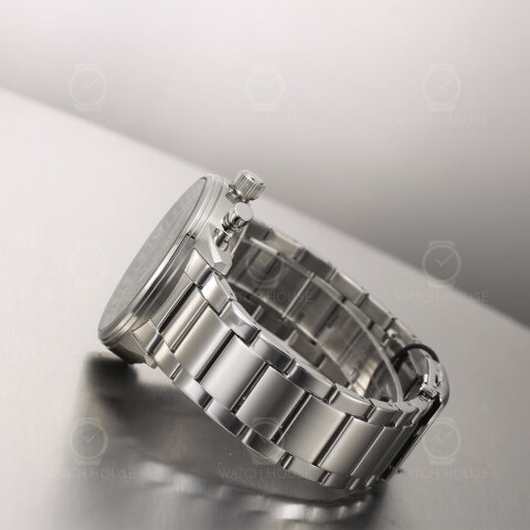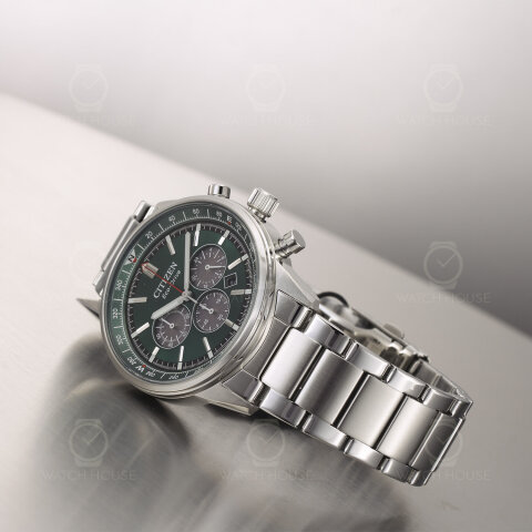 Grün dominiert das Erscheinungsbild dieser Citizen und verleiht dem Zifferblatt eine markante, fast instrumentelle Tiefe. Der satte Farbton wird von silbernen Totalisatoren und klaren Baton-Indizes präzise gegliedert, wodurch eine ausgewogene und strukturierte Wirkung entsteht. Das gebürstete Edelstahlgehäuse und das massiv wirkende Metallband unterstreichen die technische Nüchternheit und verleihen der Uhr eine sachliche, zugleich selbstbewusste Präsenz am Handgelenk.