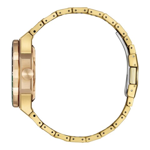Die Citizen NB6033-51E aus der renommierten Series 8 Kollektion präsentiert sich in einer faszinierenden Farbgebung: Ein tiefschwarzes Zifferblatt, das an die unendliche Weite des Kosmos erinnert, trifft auf eine zweifarbige Lünette in sattem Grün und Schwarz – ein visuelles Zusammenspiel, das Eleganz und Abenteuerlust gleichermaßen verkörpert. Das Gehäuse und das Armband aus Edelstahl sind in einem warmen Goldton gehalten, der sowohl klassische Raffinesse als auch moderne Ästhetik ausstrahlt.