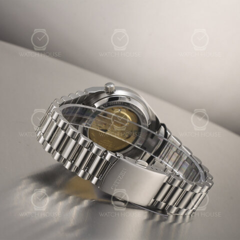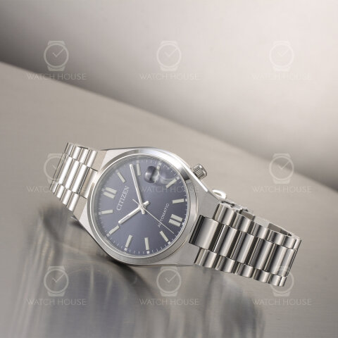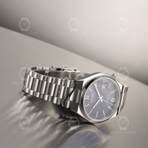 Die Citizen Tsuyosa 37mm Automatik in Blau zeigt sich mit einem klaren, modernen Erscheinungsbild, das durch das kühle Zifferblatt in tiefem Blau geprägt wird und eine harmonische Verbindung mit dem silberfarbenen Edelstahlgehäuse eingeht. Das 37 Millimeter große Gehäuse wirkt kompakt und zurückhaltend, während die polierten Glieder des Armbandes der Uhr einen subtilen Glanz verleihen. Mit Datumslupe, schlichten Baton-Indizes und den leuchtenden Zeigern bleibt die Gestaltung funktional, gleichzeitig aber von einer eleganten Sachlichkeit, die sich mühelos in Alltag und Freizeit integriert.