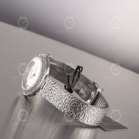 The Bulova Phantom Crystal Quartz women's watch 96L329 Silver presents itself with a silver-colored dial, which is decorated by sparkling zirconia stones as an hourly indices and is framed by a crystal bezel that impressively reflects the light with every movement. The structured stainless steel bracelet takes up the shine of the housing and, thanks to its special texture, sets a striking contrast to the polished finish. With its 32 millimeter housing, the watch looks elegant and glamorous, but remains filigree and feminine.