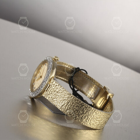 The Bulova Phantom Crystal Quartz women's watch 98L321 Gold immediately catches the eye due to its champagne-colored dial with sparkling zirconia indices, while the bezel occupied with crystals reflects the light in all facets. The gold -colored stainless steel case and the structured bracelet in the same tint give it a particularly glamorous effect. With its clearly drawn Dauphine tolerers and the finely coordinated polish, the clock looks luxurious without appearing overloaded, and sets a striking, stylish statement on the wrist.