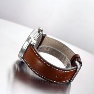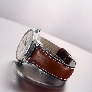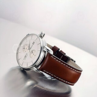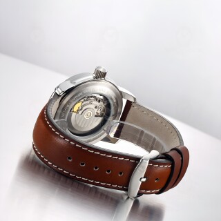 The Zeppelin Atlantic 8426-5 presents a harmonious interplay of cool silver and warm brown tones. Its polished stainless steel case, measuring 43 millimeters in diameter, gives the watch a clear, refined presence, while the beige dial with fine baton indices exudes calm elegance. The smooth brown leather strap with white contrast stitching perfectly complements the classic appearance. In the dark, the luminous coating reveals a gentle blue glow that strikingly accentuates the symmetry of the regulator dial without appearing intrusive.