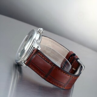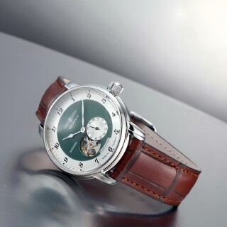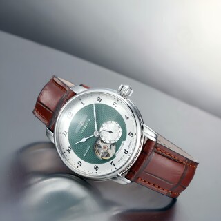 The Zeppelin Friedrichshafen Automatic watch 8566-2 is particularly alive due to its green guillochated dial, whereby the open unrest makes the mechanical inner life impressively visible at six o'clock and thus underlines the character of a skeletal watch. The Breguet dials on the bright reel give the dial a classic elegance, while the brown leather bracelet with crocodic trap forms a warm, contrasting supplement to the cool silver of the polished stainless steel case. Overall, there is a harmonious balance between technical sophistication and traditional design.
