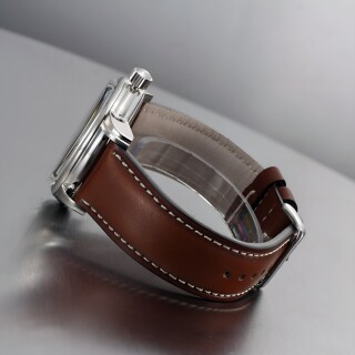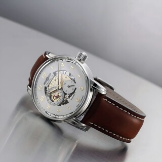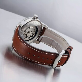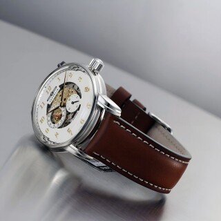 The Zeppelin New Captain’s Line 8658-1 Skeleton presents itself in a polished stainless-steel case that elegantly contrasts the bright sheen of the metal with the warm dark brown of the leather strap. The skeletonized dial reveals the intricate structures of the movement, framed by golden numerals and delicate hands. It is this combination of transparent mechanics and classic design that lends the watch a refined, almost architectural depth.