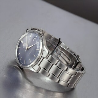 Die Orient Bambino 38mm Automatik F672 mit blauem Zifferblatt und Edelstahlarmband verbindet zeitlose Eleganz mit vielseitiger Funktionalität. Das faszinierende blaue Zifferblatt im Sonnenschliff reflektiert das Licht auf eindrucksvolle Weise und wird durch silberfarbene Indizes und elegante Dauphine-Zeiger stilvoll ergänzt. Das polierte Edelstahlgehäuse und das passende Edelstahlarmband sorgen für ein schlankes, robustes Design und bieten hervorragenden Tragekomfort für den Alltag. Mit der praktischen Datumsanzeige bei 3 Uhr und dem präzisen Automatikwerk F6724 vereint diese Uhr Funktionalität mit Stil. Perfekt für formelle und legere Anlässe gleichermaßen, ist diese Orient Bambino ein vielseitiger und edler Zeitmesser, der jedes Outfit mühelos aufwertet.