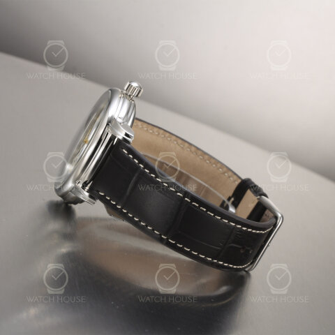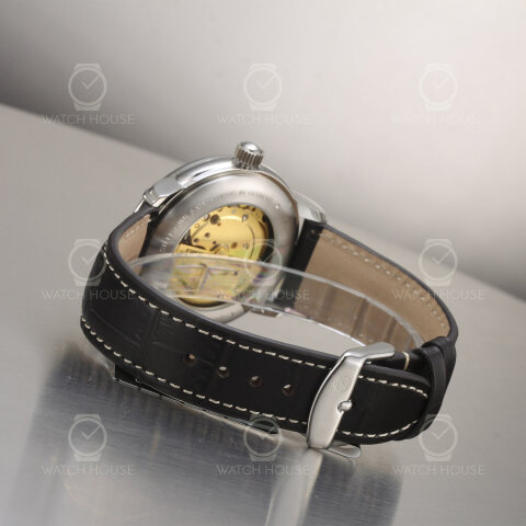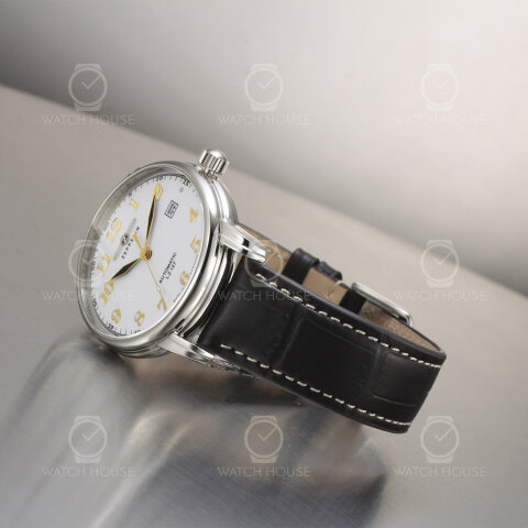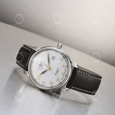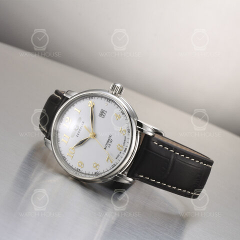 Die Zeppelin LZ127 Graf Zeppelin Automatikuhr präsentiert sich mit einem weißen Zifferblatt, das durch goldfarbene arabische Ziffern und ebenso goldene Zeiger eine warme Eleganz erhält. Der Datumsanzeiger auf drei Uhr fügt sich unaufdringlich ein, während das Edelstahlgehäuse in polierter Ausführung einen klaren Rahmen bildet. Durch den Glasboden lässt sich das mechanische Werk erkennen, und das schwarze Lederarmband mit heller Kontrastnaht rundet das klassische, harmonische Erscheinungsbild ab.