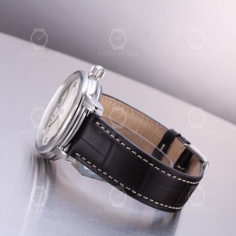 Die Zeppelin LZ 127 Graf Zeppelin Automatikuhr präsentiert sich mit einem hellen, beigefarbenen Zifferblatt, das durch großflächige arabische Ziffern in dunkler Typografie einen klassischen und gut ablesbaren Eindruck vermittelt. Das polierte Edelstahlgehäuse ergänzt die zurückhaltende Farbgebung harmonisch, während die schwertförmigen Zeiger durch ihre dezente Leuchtfunktion auch bei schwachem Licht erkennbar bleiben. Das dunkelbraune Lederarmband mit Krokoprägung und heller Kontrastnaht unterstreicht den eleganten Charakter und verleiht der Uhr eine traditionelle, fast nostalgische Anmutung.