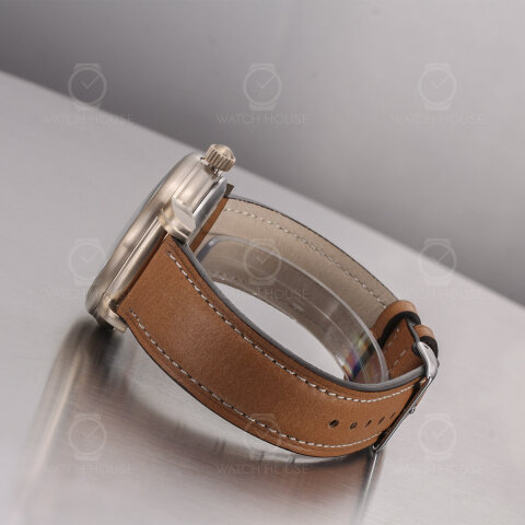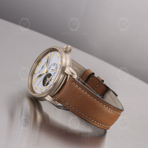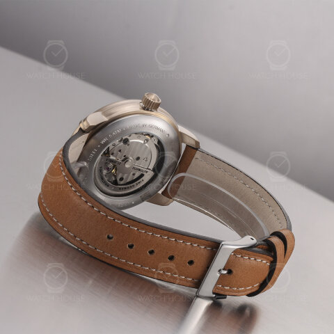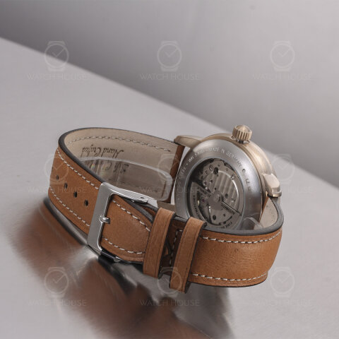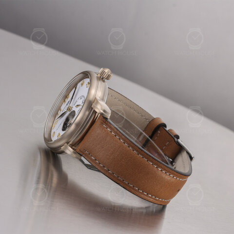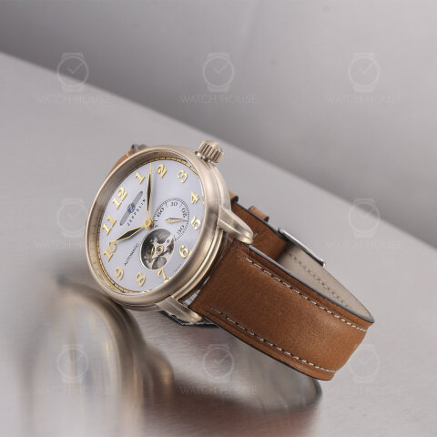 Die Zeppelin LZ127 Graf Zeppelin 7664-1 präsentiert sich in einem fein gebürsteten Gehäuse in sanftem Goldton, das durch das helle, braune Lederarmband mit weißer Kontrastnaht eine warme, klassische Anmutung erhält. Auf dem weißen Zifferblatt setzen sich goldene arabische Ziffern und schlanke Zeiger elegant ab, während die geöffnete Unruh bei sechs Uhr einen faszinierenden Blick auf das schlagende Herz des Uhrwerks erlaubt – ein feines Detail, das technische Raffinesse und stilvolle Zurückhaltung verbindet.