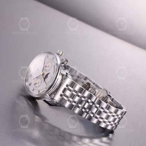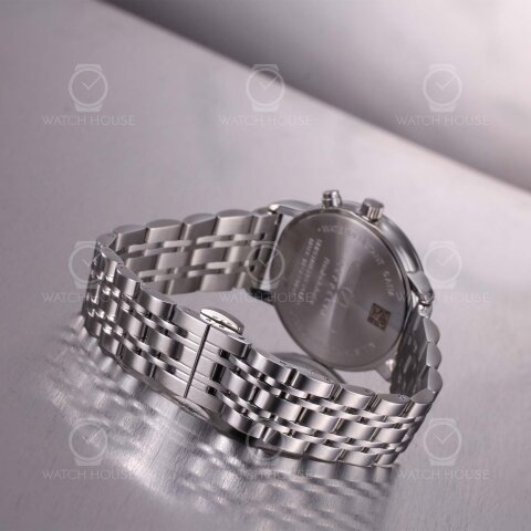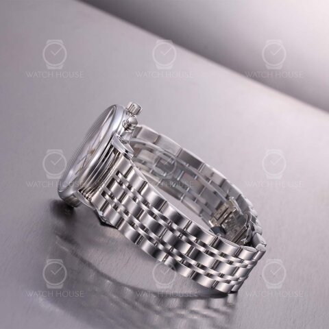 Die Zeppelin Friedrichshafen Damenuhr zeigt sich mit einem weißen Zifferblatt, dessen „Clous de Paris“-Struktur in feinem Relief eine geordnete, klassische Anmutung erzeugt und gleichzeitig einen Hauch französischer Uhrentradition verströmt; ergänzt durch elegante Breguet-Ziffern, die filigrane Mondphasenanzeige und das polierte Edelstahlgehäuse mit feingliedrigem Armband entsteht ein harmonischer Zeitmesser, der Eleganz und Funktionalität vereint.