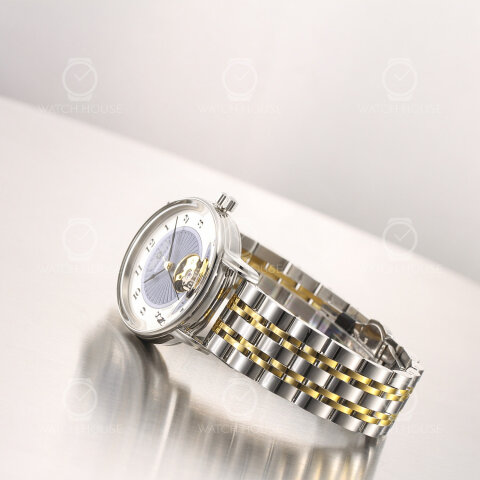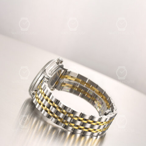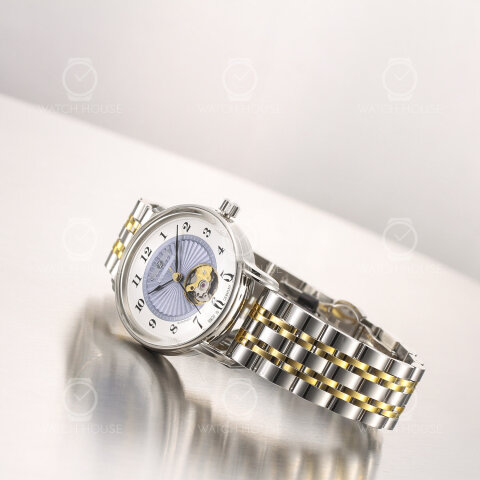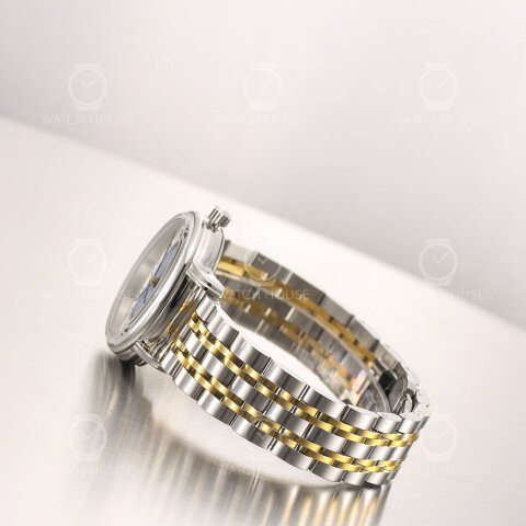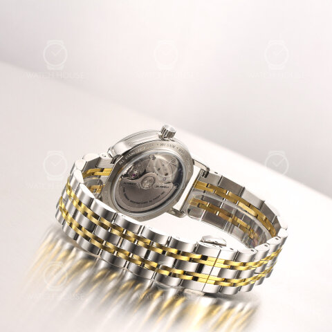 Die Zeppelin Friedrichshafen 8567M-3 präsentiert sich mit einem eleganten Zusammenspiel aus kühlem Edelstahl und goldfarbenen Akzenten, die das zweifarbige Gliederarmband lebendig wirken lassen. Das blau guillochierte Zifferblatt mit feiner Strahlung erinnert an das Spiel von Licht auf ruhigem Wasser, während die offenen Einblicke in die Unruh dem Zeitmesser eine faszinierende Tiefe verleihen. Zarte, geschwungene Ziffern und das polierte Silbergehäuse runden das harmonische Erscheinungsbild ab, wodurch die Uhr eine feine Balance zwischen technischer Präzision und femininer Anmut findet.