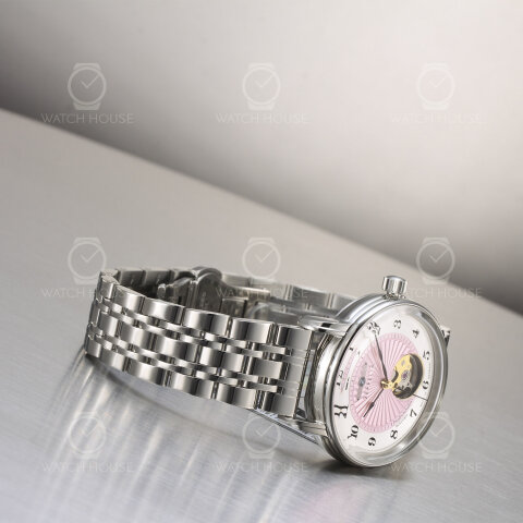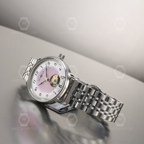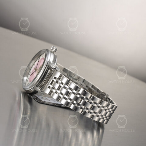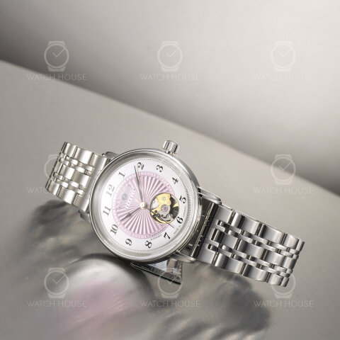 Die Zeppelin Friedrichshafen vereint ein fein guillochiertes Zifferblatt in sanftem Rosaton mit einer offenen Unruh bei sechs Uhr, die einen reizvollen Einblick in das Uhrwerk gewährt. Die schwarzen Breguet-Ziffern heben sich klar vom hellen Hintergrund ab und setzen klassische Akzente, während das polierte Edelstahlgehäuse die feminine Eleganz dezent unterstreicht. Mit dem silberfarbenen Edelstahlarmband im mehrgliedrigen Design wirkt die Uhr modern und gleichzeitig zeitlos, wodurch ein harmonisches Zusammenspiel von Farbe, Struktur und Material entsteht.