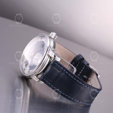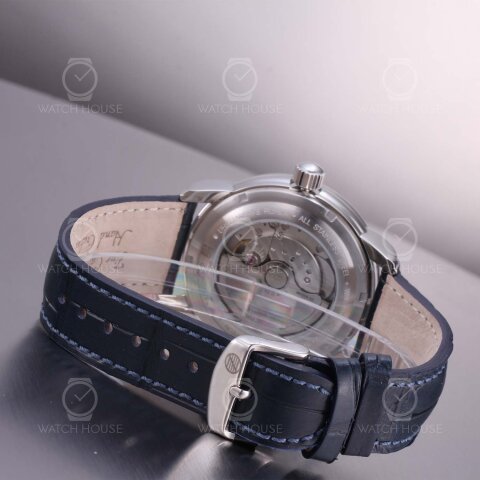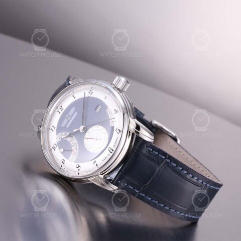 Die Zeppelin 8590-3 ist eine Uhr, die sowohl den Geist der Innovation als auch die Seele der Tradition einfängt. Mit ihrem stahlblauen, guillochierten Zifferblatt, das elegant das Licht einfängt und in verschiedenen Schattierungen reflektiert, bietet sie eine visuelle Tiefe, die selten in modernen Uhren zu finden ist. Diese Farbgebung, gepaart mit einer Gangreservenanzeige und einer 24-Stunden-Anzeige sowie einem praktischen Datumsfenster, macht die Uhr zu einem perfekten Begleiter für den anspruchsvollen Träger, der sowohl funktionale Überlegenheit als auch ästhetische Brillanz schätzt. Das dunkelblaue Kalbslederarmband ergänzt das Zifferblatt nicht nur farblich, sondern auch durch seine feine Textur, die dem Träger ein Gefühl von Luxus und Komfort verleiht. Die 8590-3 von Zeppelin steht nicht nur für die Zeitmessung, sondern ist ein Symbol für die elegante Verschmelzung von Vergangenheit und Zukunft in einem handwerklich meisterhaften Design.