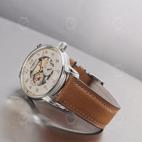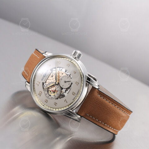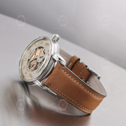 Die Zeppelin New Captain’s Line 8658-5 Skelettiert beeindruckt durch ihr poliertes Edelstahlgehäuse, das in harmonischem Kontrast zum hellbraunen Lederarmband steht. Das beige Zifferblatt öffnet sich zur Mitte hin und gibt den Blick auf das skelettierte Uhrwerk frei, dessen feine Strukturen und goldene Akzente eine elegante technische Tiefe erzeugen. Goldfarbene Ziffern und Zeiger fügen sich sanft in das Gesamtbild ein und verleihen der Uhr einen klassisch-warmen Charakter.